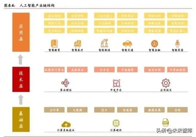 目前,全球人工智能产业的生态系统正逐步成型。依据产业链上下游关系,可以将人工智 能划分为基础支持层、中间技术层和下游应用层。基础层是人工智能产业的基础,主要提 供硬件(芯片和传感器)及软件(算法模型)等基础能力;技术层是人工智能产业的核心, 以模拟人的智能相关特征为出发点,将基础能力转化成人工智能技术,如计算机视觉、智 能语音、自然语言处理等应用算法研发。其中,技术层能力可以广泛应用到多个不同的应 用领域;应用层是人工智能产业的延伸,将技术应用到具体行业,涵盖制造、交通、金融、 医疗等 18 个领域,其中医疗、交通、制造等领域的人工智能应用开发受到广泛关注。