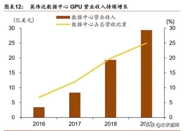 GPU(Graphics Processing Unit)的设计和生产均已成熟,占领 AI 芯片的主要市场份 额。GPU 擅长大规模并行运算,可平行处理海量信息,仍是 AI 芯片的首选。据 IDC 预测, 2019 年 GPU 在云端训练市场占比高达 75%。在全球范围内,英伟达和 AMD 形成双寡头 垄断,尤其是英伟达占 GPU 市场份额的 70%-80%。英伟达在云端训练和云端推理市场推 出的 GPU Tesla V100 和 Tesla T4 产品具有极高性能和强大竞争力,其垄断地位也在不断 强化。目前中国尚未“入局”云端训练市场。由于国外 GPU 巨头具有丰富的芯片设计经 验和技术沉淀,同时又具有强大的资金实力,中国短期内无法撼动 GPU 芯片的市场格局。