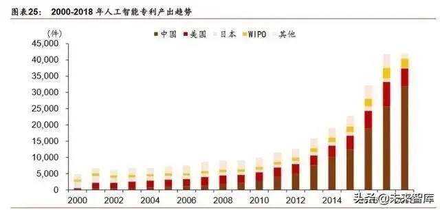专利申请量是衡量人工智能技术创新能力和发展潜质的核心要素。在全球范围内,人工智 能专利申请主要来源于中国、美国和日本。2000 年至 2018 年间,中美日三国 AI 专利申 请量占全球总申请量的 73.95%。中国虽在 AI 领域起步较晚,但自 2010 年起,专利产出 量首超美国,并长期雄踞申请量首位。