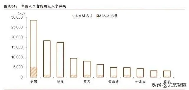 人才的数量与质量直接决定了人工智能的发展水平和潜力。目前,全球人工智能人才分布 不均且短缺。据清华大学统计,截至 2017 年,人才储备排名前 10 的国家占全球总量的 61.8%。欧洲 28 国拥有 43064 名人工智能人才,位居全球第一,占全球总量的 21.1%。美国和中国分别以 28536、18232 列席第二、第三位。其中,中国基础人才储备尤显薄弱。根据腾讯研究院,美国 AI 技术层人才是中国 2.26 倍,基础层人才数是中国的 13.8 倍。