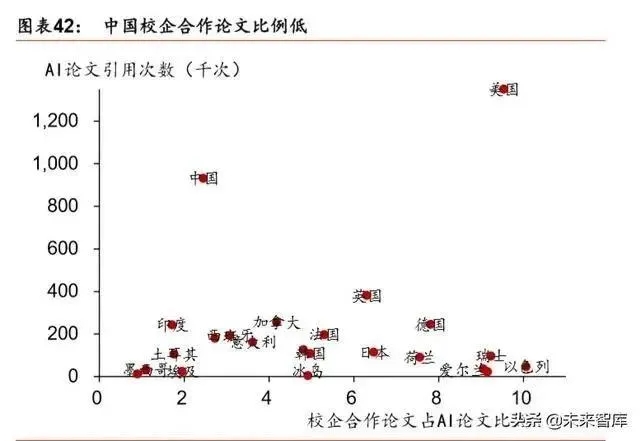 从发文主体来看,科研机构和高校是目前中国人工智能知识生产的绝对力量,反映出科研成 果转化的短板。而美国、欧盟和日本则呈现企业、政府机构和高校联合参与的态势。据Scopus 数据显示,2018 年,美国企业署名 AI 论文比例是中国的 7.36 倍,欧盟的 1.92 倍。2012 年 至 2018 年,美国企业署名 AI 论文比例增长 43pct,同期中国企业署名 AI 论文仅增长 18pct。 此外,人工智能与市场应用关联密切,校企合作论文普遍存在。而我国校-企合作论文比例仅为 2.45%,与以色列(10.06%)、美国(9.53%)、日本(6.47%)差别较大。从产学结合的角度, 中国人工智能研究以学术界为驱动,企业在科研中参与程度较低,或难以实现以市场为导向。