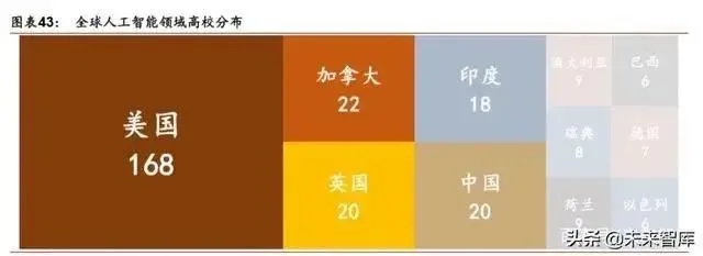 中国人工智能高校数量实位于第二梯队,实力比肩美国。高校是人工智能人才供给和论文 产出的核心载体。据腾讯研究院统计,全球共 367 所高校设置人工智能相关学科,其中, 美国(168 所)独占鳌头,占据全球的 45.7%。中国拥有 20 所高校与英国并列第三,数 量上稍显逊色。此外,中国高校实力普遍上升,表现强劲。据麻省理工学院 2019 年发布 的 AI 高校实力 Top20 榜单中,中国清华大学、北京大学包揽前两名,较 2018 年分别上 升 1 个和 3 个名次。