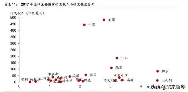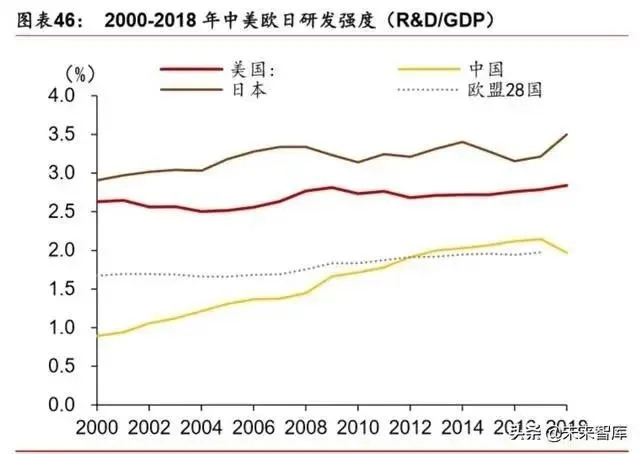 中国研发高投入高强度,在全球研发表现中占据重要地位。从研发投入的角度,美国、中 国、日本和德国始终是全球研发投入的主力军。据 IDC 统计显示,2018 年四国的研发投 入总和占全球总量的比例已达 60.77%。其中,美国凭借其强大的研发实力连续多年位居 全球研发投入的榜首。近年来,中国研发投入呈现一路猛增的强进势头,据 Statista 统计, 国内 2019 年研发投入额为 5192 亿美元,仅次于美国。且趋势上与美国差距不断缩小, 2000 年至 2019 年,CAGR 高达 14.43%,同期美国 CAGR 仅 2.99%。由于经济疲软等 诸多原因,欧盟与日本则呈现较为缓慢的上升趋势。据研发投入与强度增长的趋势推测, 中国或在 1-2 年内取代美国的全球研发领先地位。从研发强度的角度,中国研发强度总体 上呈逐步攀升的趋势,且涨幅较大。但对创新活动投入强度的重视程度仍与美国和日本存 在差距。2018 年中国研发强度 1.97%,低于日本和美国 1.53、0.87 个百分点。