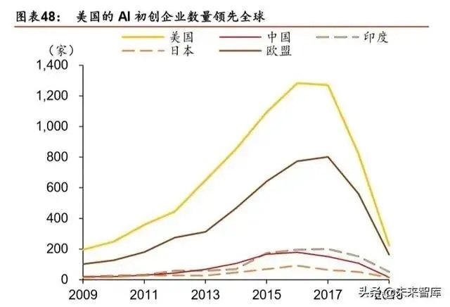 国内人工智能追赶速度迅猛,但基础薄弱问题突出。在强有力的战略引领和政策支持下、 依托庞大的数据体量、丰富的应用场景和高度的互联网普及率,中国人工智能产业持续保 持蓬勃发展态势,并跻身全球人工智能第一梯队。技术上,我国人工智能论文和专利申请 量长期雄踞世界首位,在国际技术竞赛中多次拔得头筹;产业上,以阿里巴巴、腾讯为代 表的科技巨头全面布局人工智能生态,以寒武纪、科大讯飞、商汤科技为代表的初创企业 深耕垂直领域,打造技术护城河。我国人工智能产业规模、资本投入、企业数量呈现爆发 式增长,智能技术与实体融合持续加强,落地场景不断丰富。但我们也应当意识到,与美 国、欧洲相比,我国在产业链分布上更加集中于应用落地端口。长期市场化导向导致国内 行业发展出现结构性失衡,基础理论缺乏、原创算法薄弱、高端芯片依赖进口等问题凸显, 这也反映出中国人工智能发展不牢的风险点。因此,站在科技创新的“巨型风口”,我们 更需要审慎后续技术路线和产业发展路径,加大科研攻关力度,补齐技术短板。