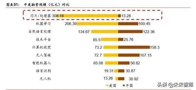 相比较美国,中国资本投向侧重易落地的终端市场。从融资层面来看,中国各领域发展较 为均衡,应用层是突出领域,如自动驾驶、计算机学习与图像、语音识别和无人机技术领 域的新增融资额均超过美国。而美国市场注重底层技术的发展。据腾讯研究院数据显示, 芯片和处理器是美国融资最多的领域,占总融资额的 31%。当前中国对人工智能芯片市场 高度重视,但受限于技术壁垒和投资门槛高,国内芯片融资处于弱势。